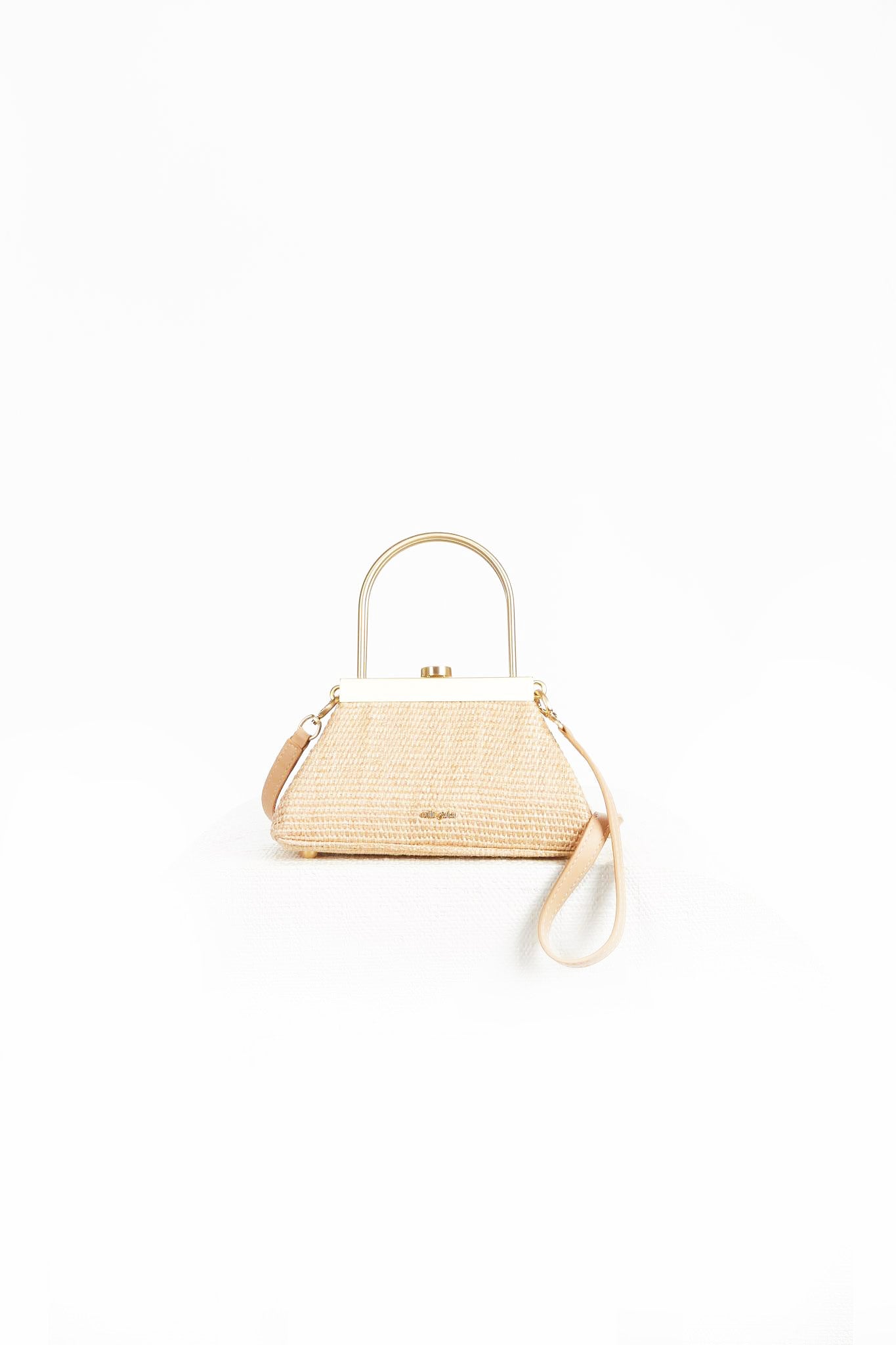 Cult Gaia's best selling natural raffia. The Mini Estelle resembles a mini sculpture. Detailed with gorgeous gold hardware, this mini bag has an angular shape and a metal top handle and chain, so you can slip onto your wrist or wear cross-body if you need to hold your coffee or phone.