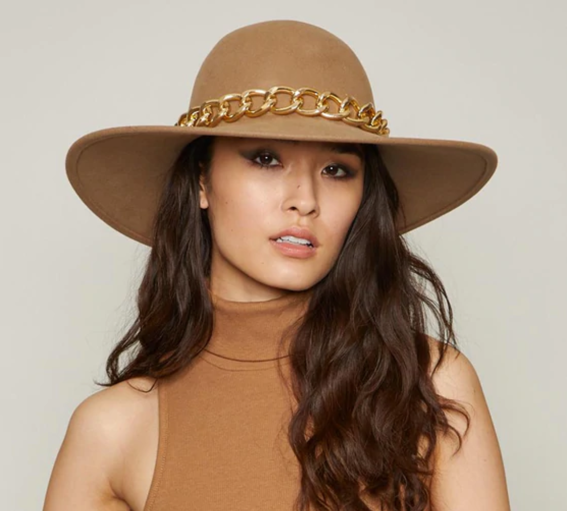 The Eugenia Kim Honey Chain Wool Felt Hat provides a captivating and sophisticated look for any occasion. With its oversized gold chain, this signature piece is a classic of the designer's core collection, worn by the likes of Beyonce and Jennifer Lopez. Feel luxurious and refined with this chic design.