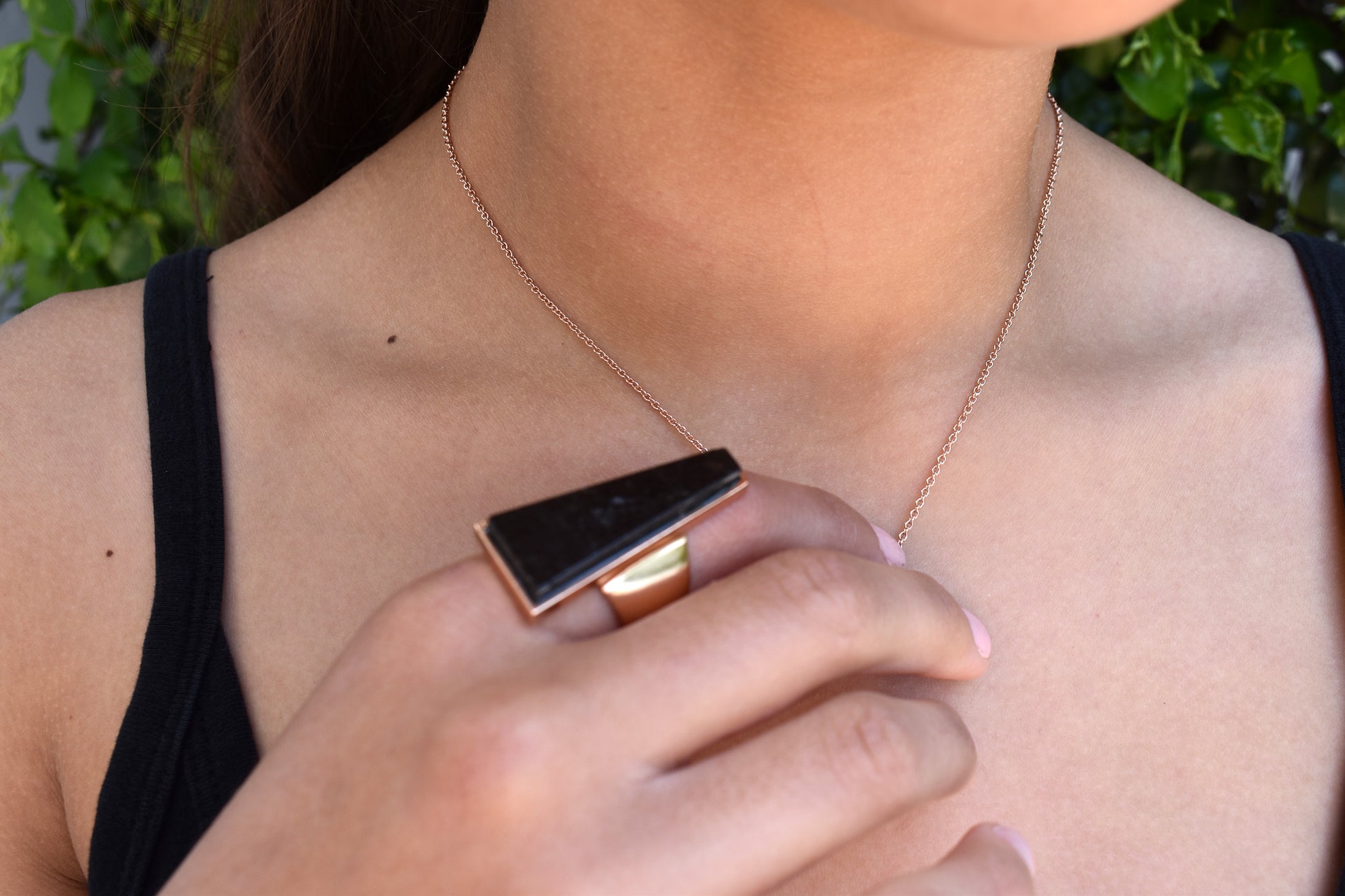 This stunning Kendra Scott Collins Rose Gold Plated Cocktail Ring is the perfect addition to any jewelry collection. Its geometric shape is set with an elegant black granite centerpiece and rose gold plated metal for an exclusive, timeless look. Perfect for any occasion, its sophisticated design will elevate your look with polished grace.