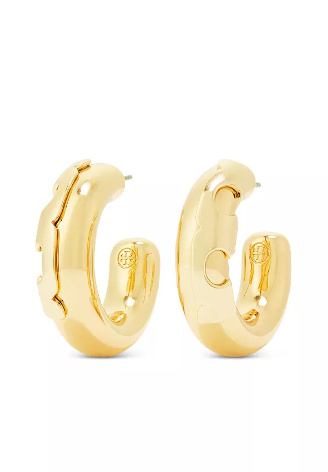 An everyday classic the Tory Burchthe Essential Hoop features an abstracted Double T in 18k-gold plated brass and crystal. From the Essential collection, these 1" diameter hoops are available in 18K yellow gold-plate. The post-back closure ensures a secure fit, while the nickel-free design offers comfort all day long.
