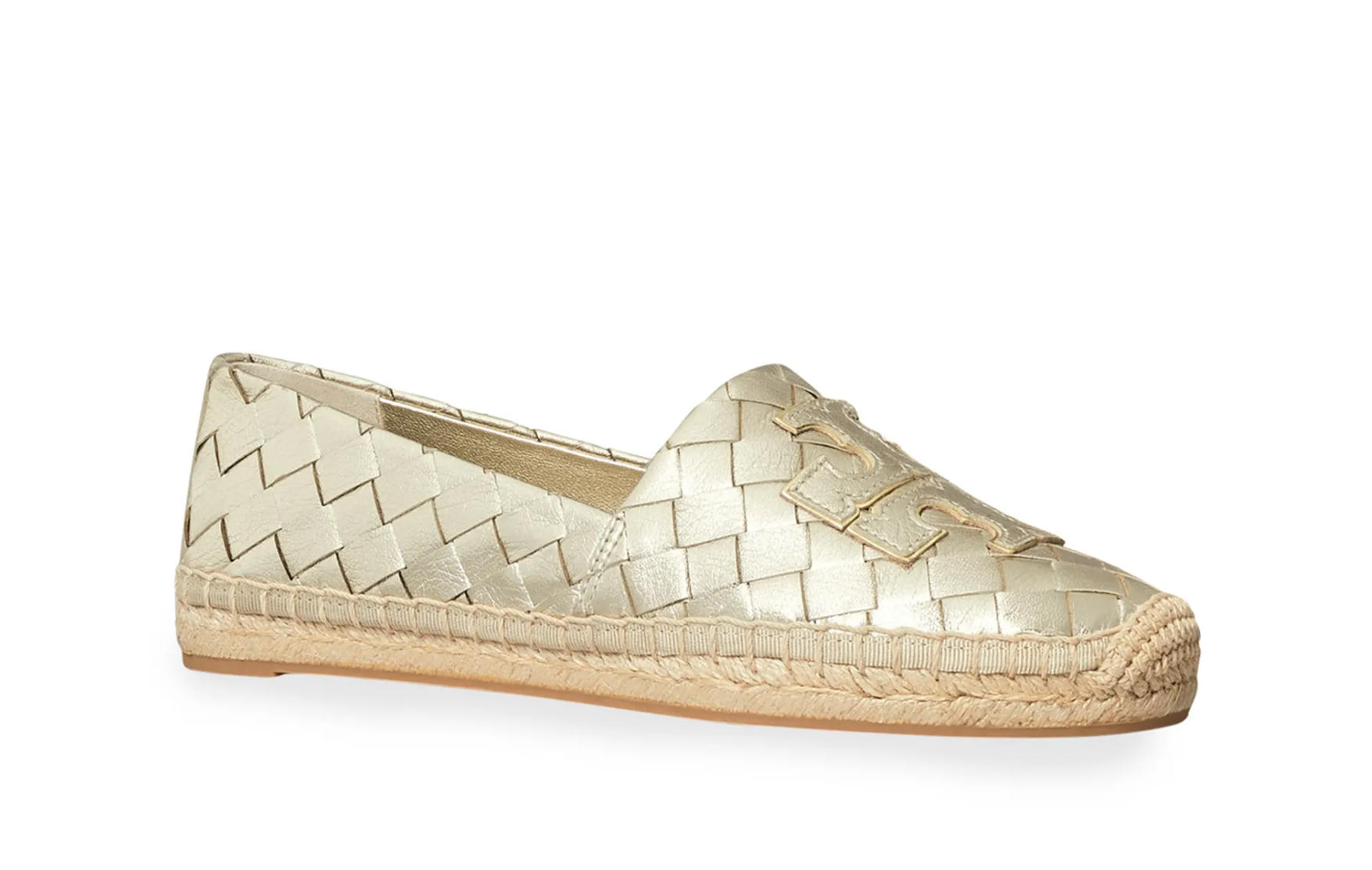 Experience the ultimate refinement of Tory Burch's Ines Woven Espadrille. Crafted from intricately woven metallic leather and displaying a signature double-raised "T" logo, these stunning espadrilles exude a chic, timeless elegance. Their sophisticated style is bound to add a touch of classic luxury to any look.