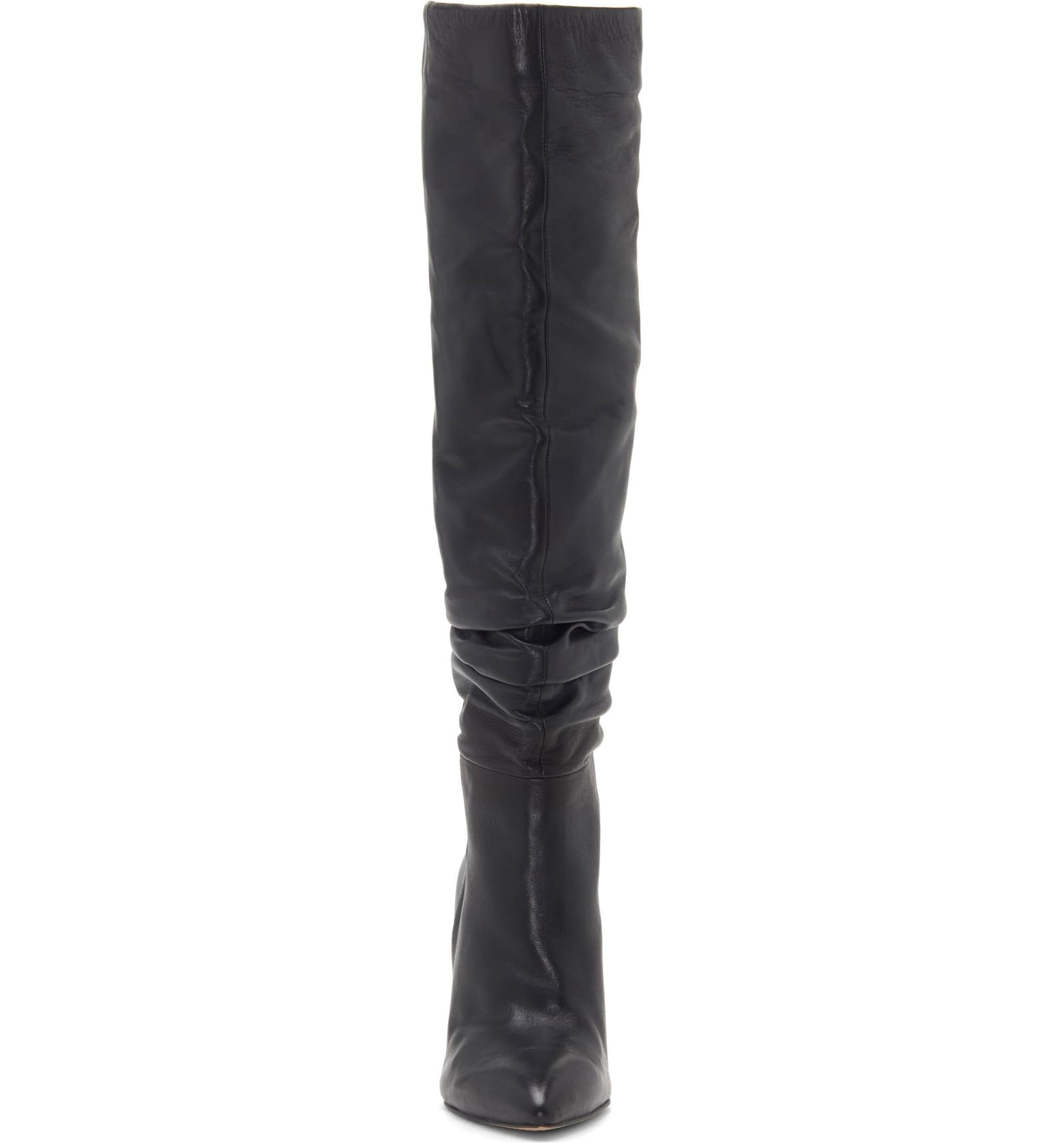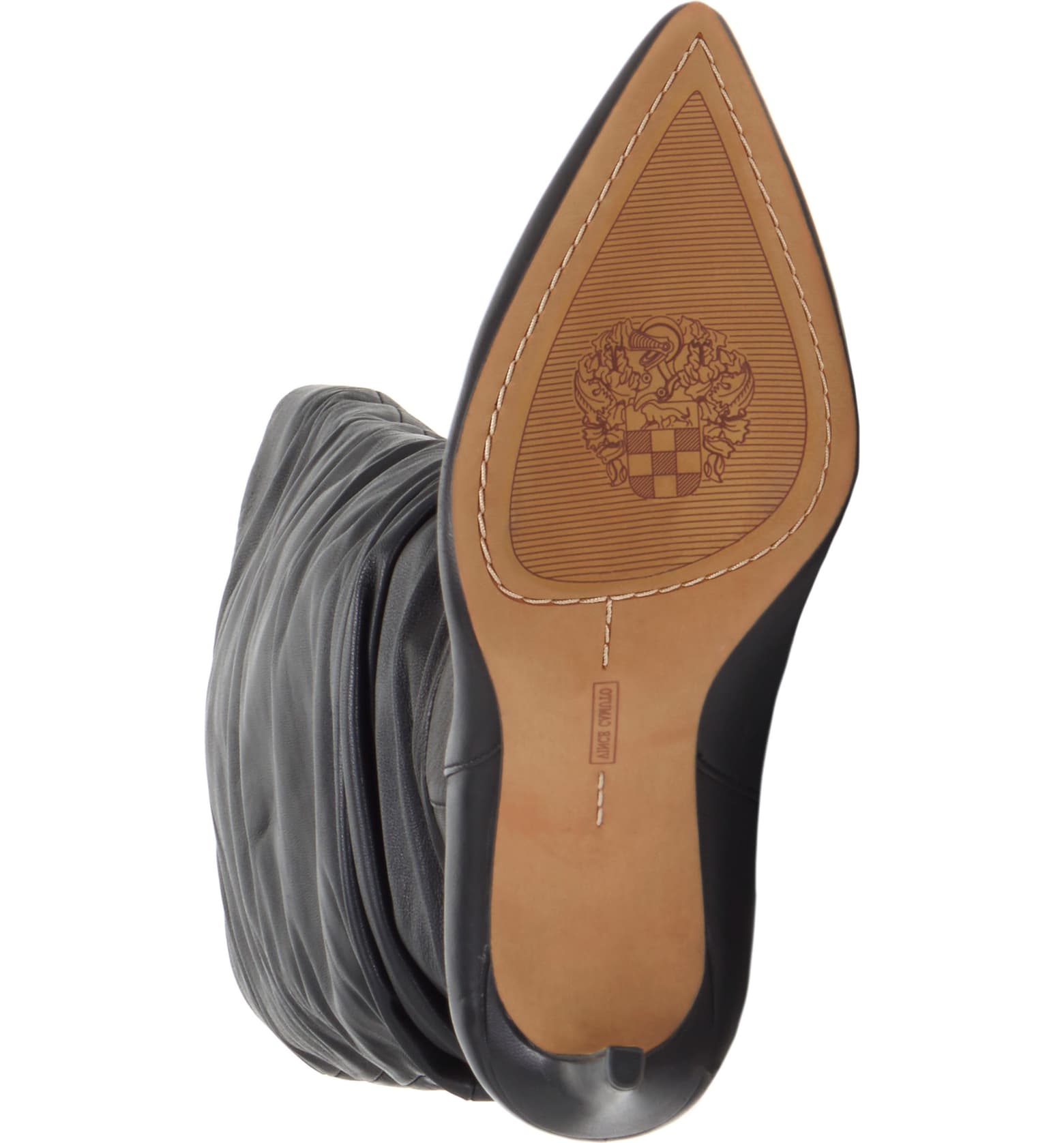 Sexy knee high leather boots featuring a stiletto heel and ruched leather at the ankle.
