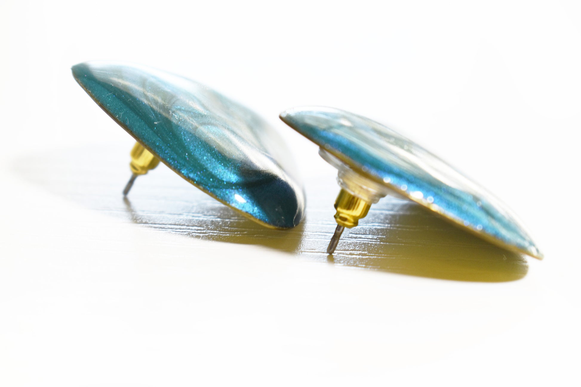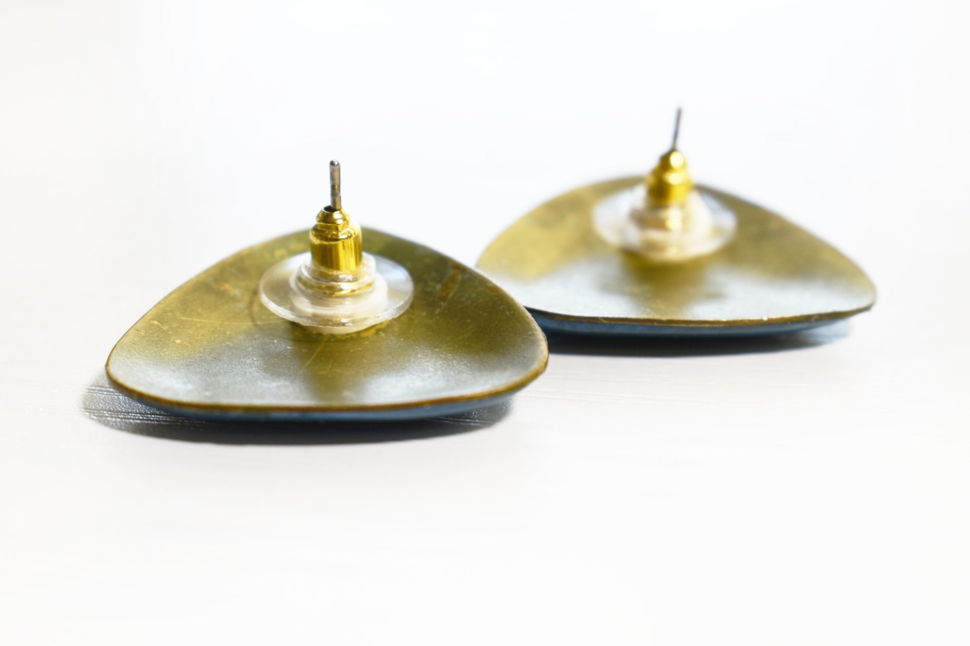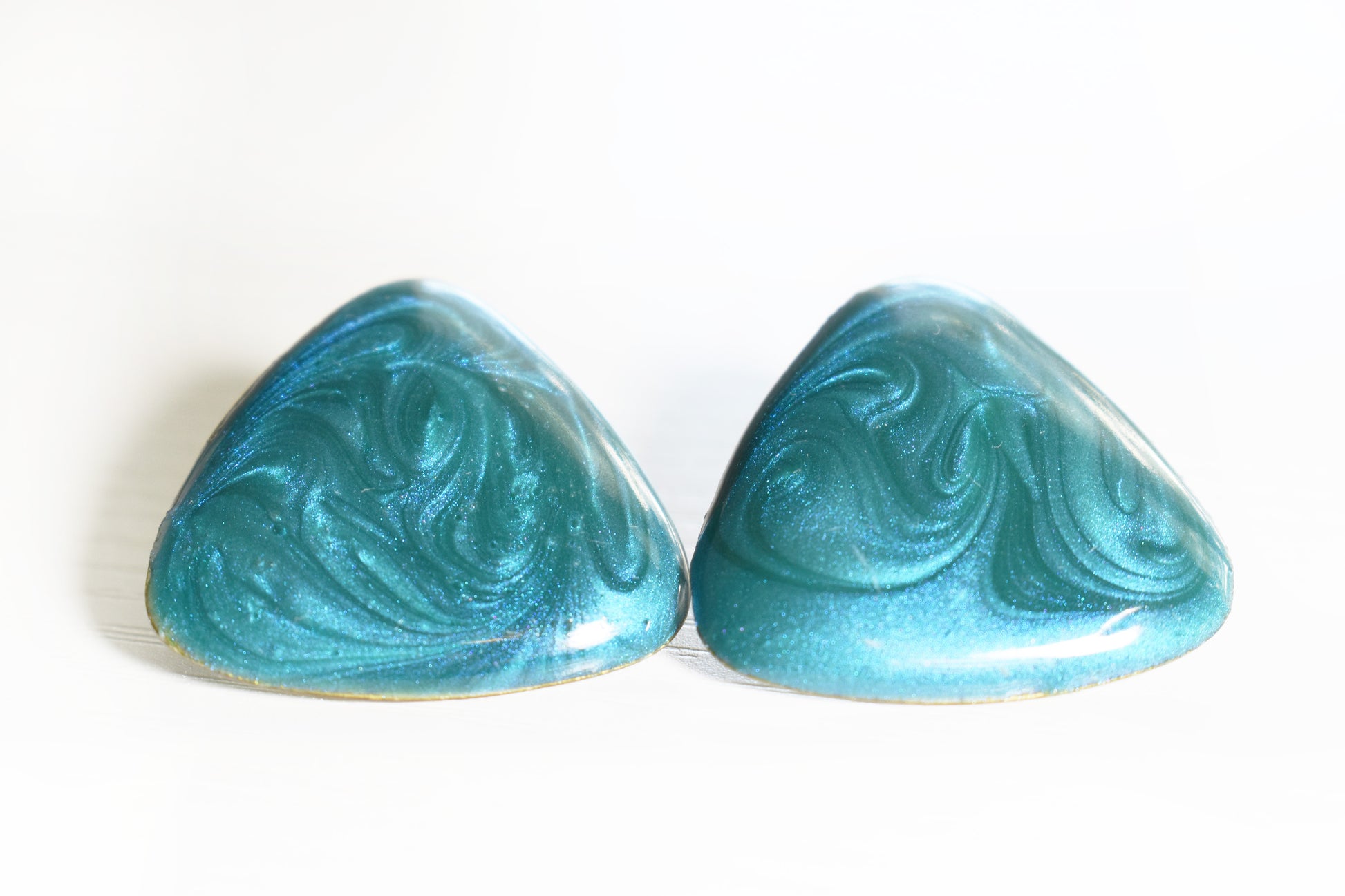These Vintage Triangular Shaped Vibrant Enamel Earrings are crafted from sparkling ocean blue enamel with a green hue, creating a captivating contrast. Featuring a rustic gold edging that accents the striking vibrant enamel, these earrings provide a classic yet modern look, perfect for any special occasion.